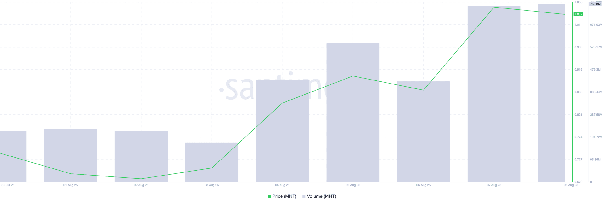 Over the past seven days, MNT’s trading volume has risen 250%, reaching $753 million at the time of writing.