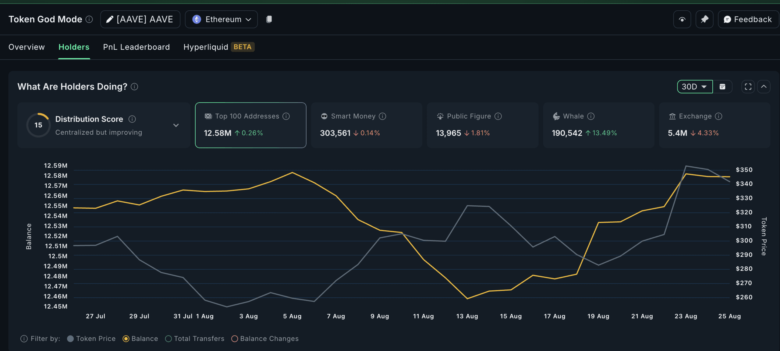 At the same time, whale wallets increased their holdings by 13.49%. Their stash rose from 17,222 Aave to 19,542 Aave, adding 2,320 tokens. At current prices, the extra holdings are worth nearly $790,000.