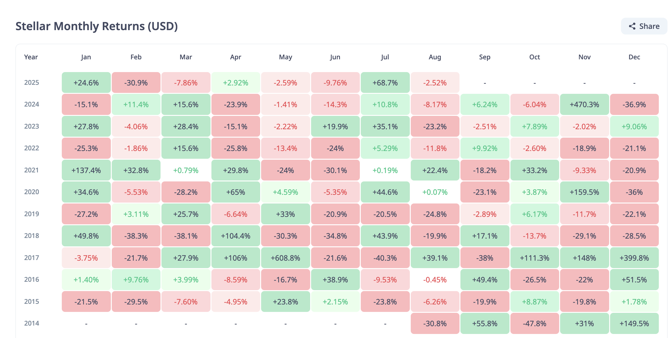 A review of XLM’s monthly returns reveals a worrying pattern. August only offered two positive ends of the month in 2017 and 2021.