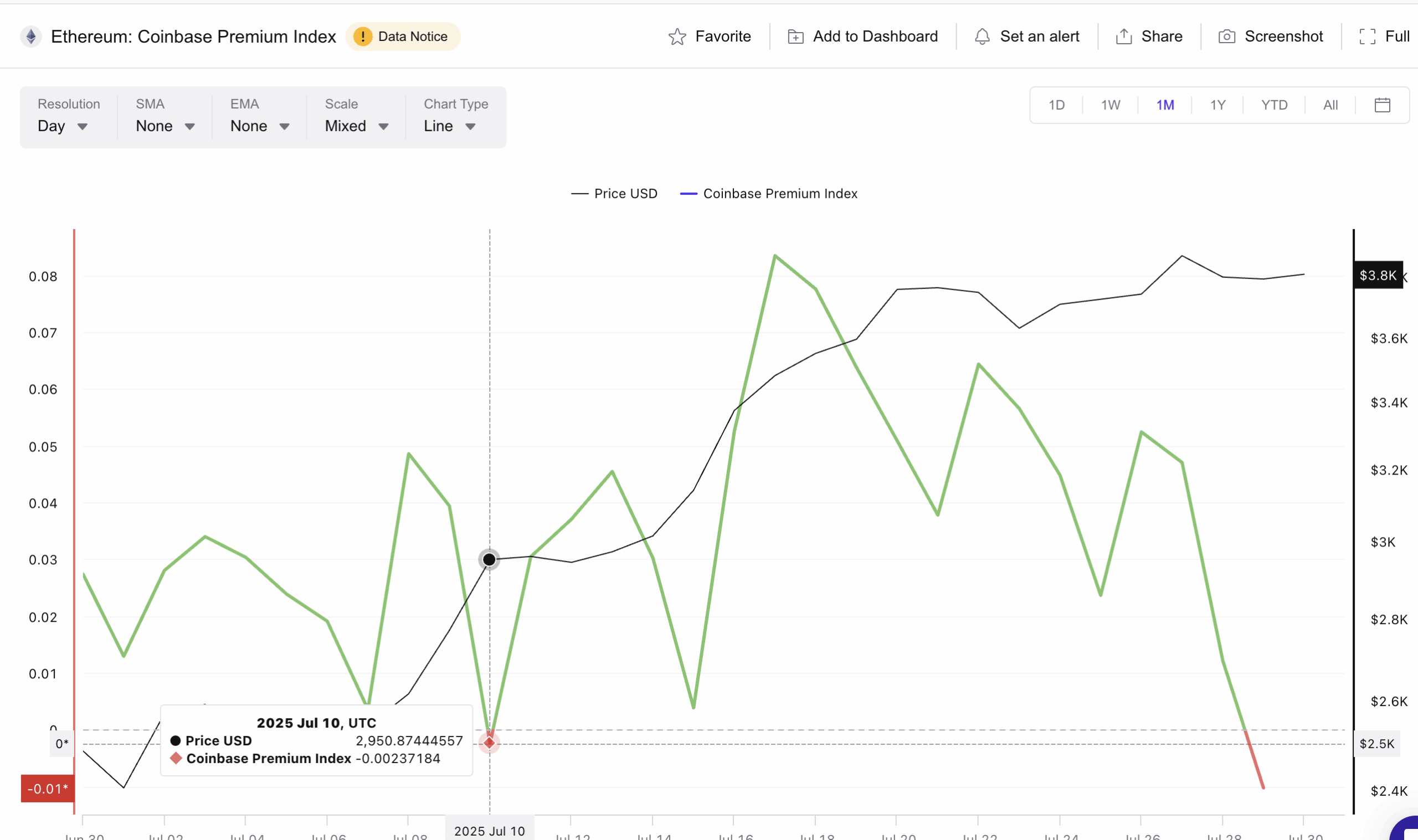 One of the most important signals comes from the Coinbase Premium Index. This indicator measures the difference between Coinbase’s Ethereum price and other global exchanges.