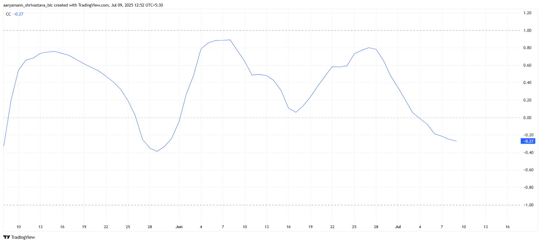 Pi Coin has experienced a dramatic change in its correlation with Bitcoin and is currently sitting at a negative 0.27. This negative correlation means that the PI coin is moving in the opposite direction from Bitcoin. Simply put, as Bitcoin rises, Pi Coin continues to struggle.