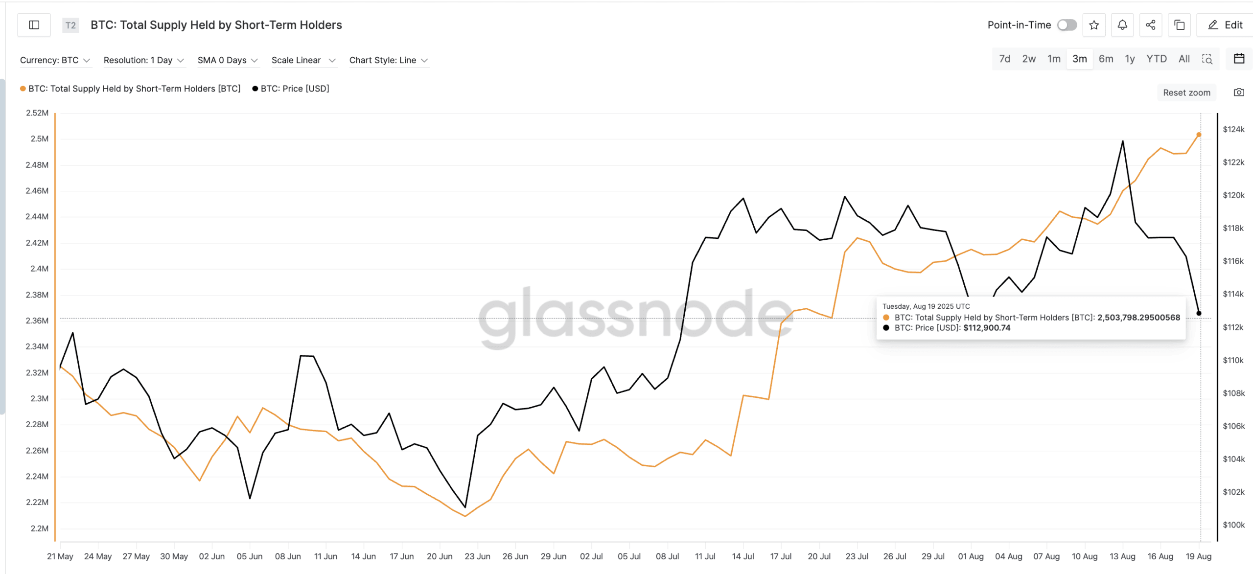 Wallet, a short-term holder that acquired Bitcoin within the last 155 days in the past few days, has increased its supply even as prices drop. Currently, the group holds 2,503,798 BTC from 2,460,514 BTC just seven days ago.