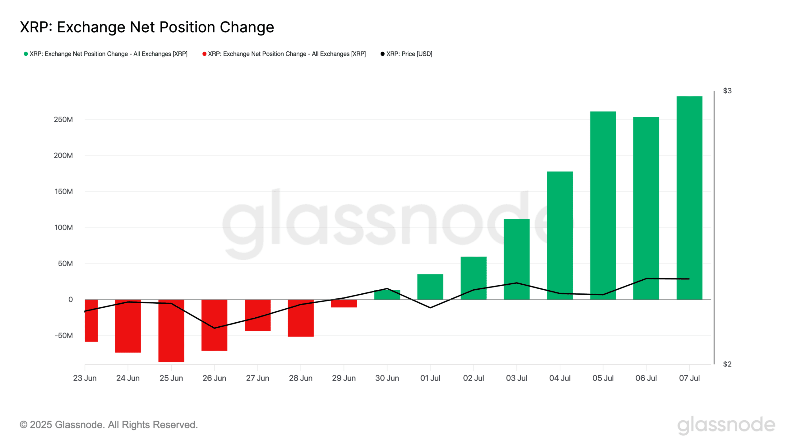 GlassNode data reveals a steady increase in XRP’s Exchange Net Position Change over the past week. On-chain data shows that this metric, which tracks the net amount of tokens travelling to centralized exchange, rose to 283 million XRP for eight months on July 7th.