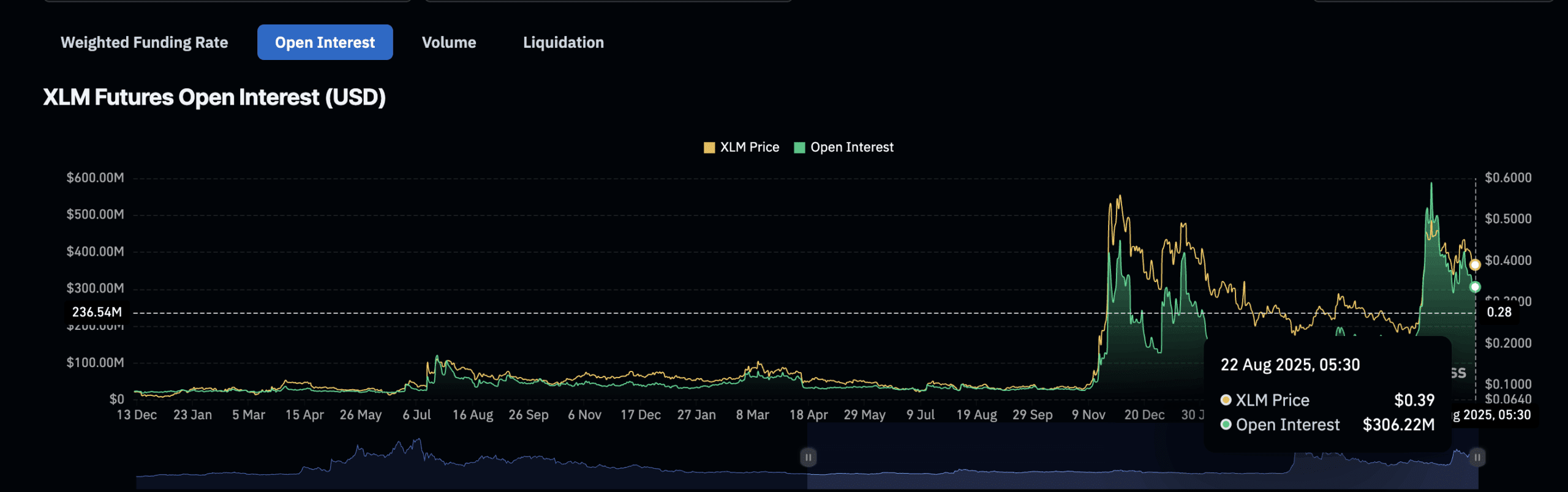 On July 18th, Stellar’s public interest reached $588.53 million as XLM prices rose. That leverage accumulation helped the shorter aperture gain momentum and promote movement. Since then, open interest has dropped to $306.22 million. This is almost a 50% decrease.