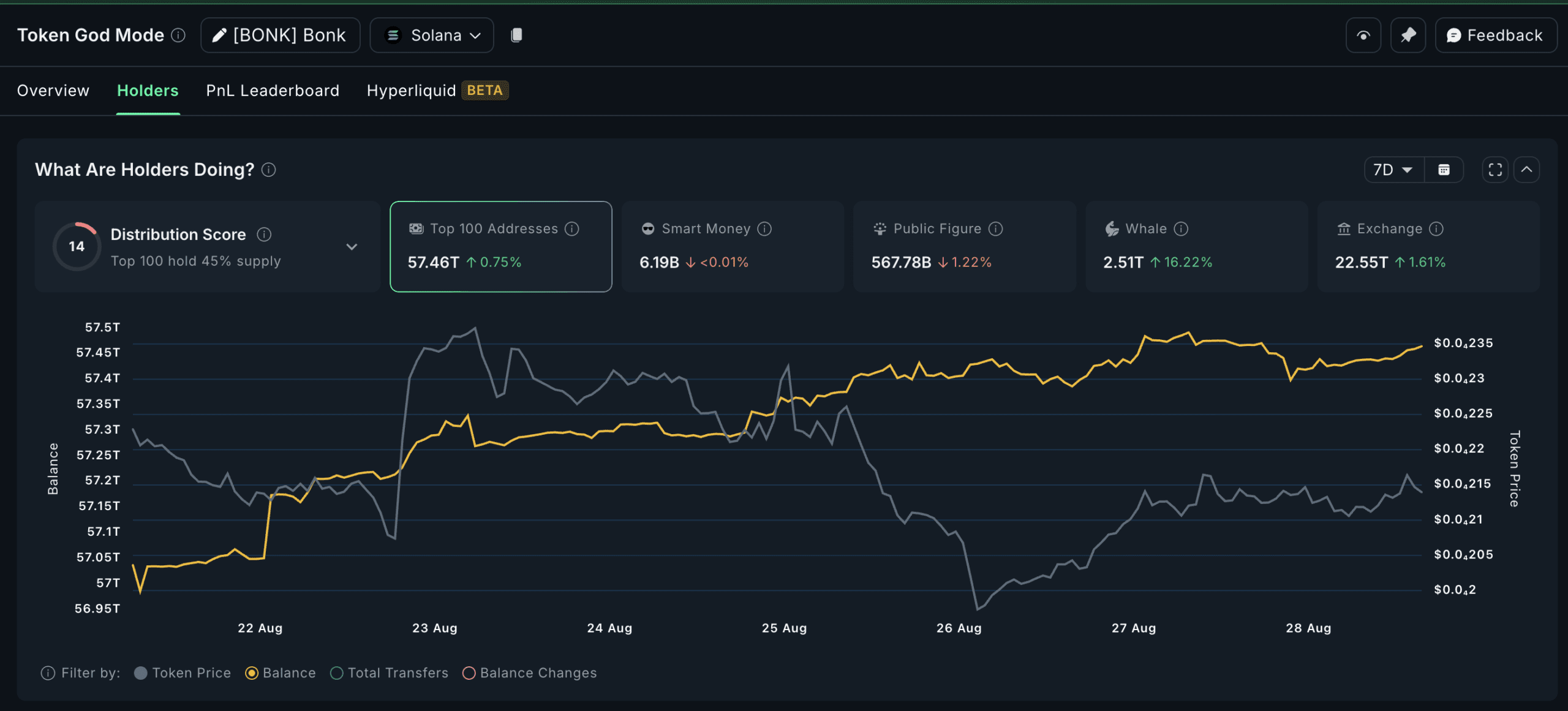 It’s possible that Bonk is preparing for a rebound despite a 32% decline in the last 30 days and barely moving last week. Whale wallets increased their holdings by 16.22% and increased their stash to 2.51 trillion bongs.