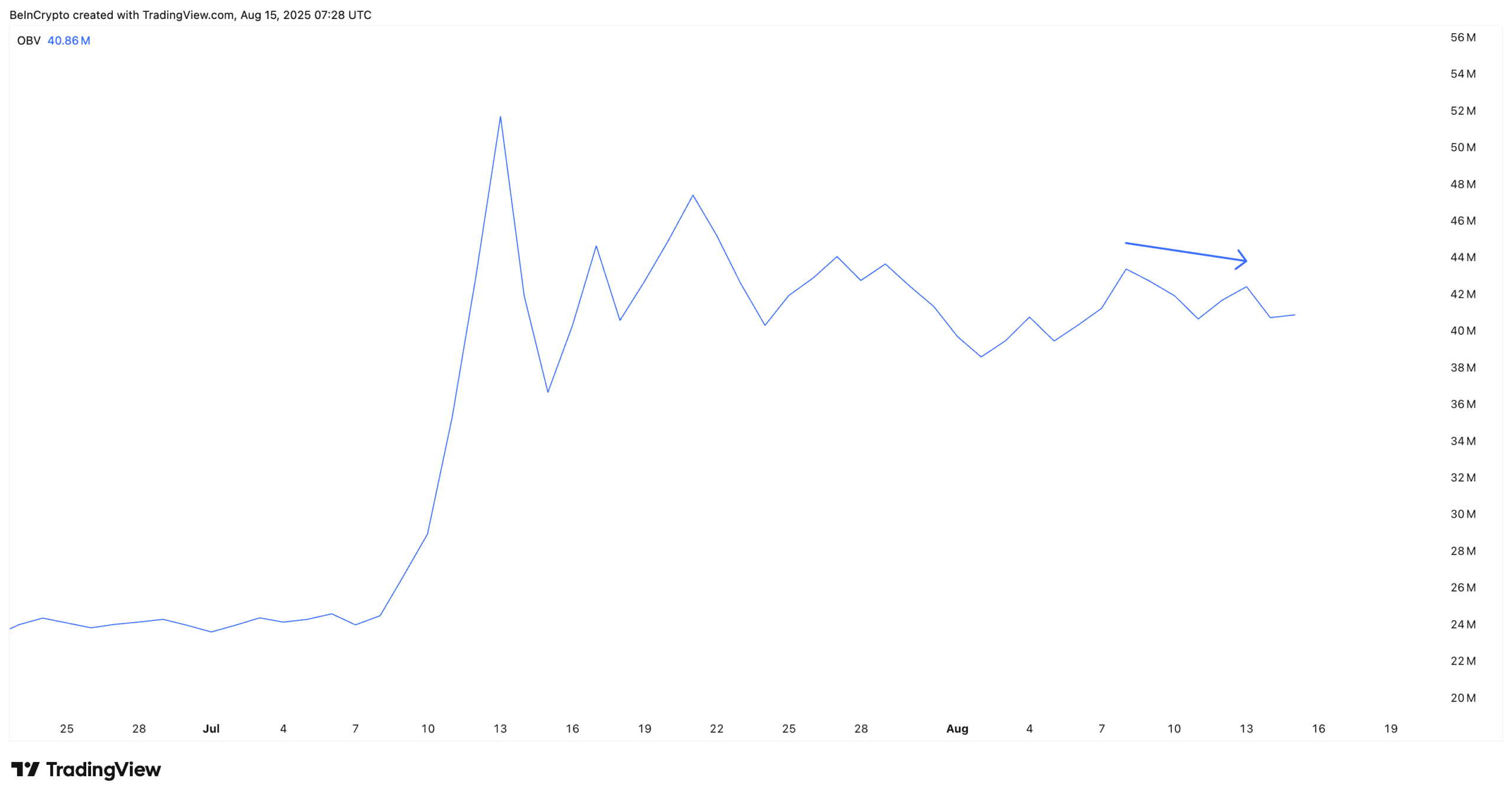 The first red flag is market participation. The XLM price achieved a high on the price chart (between August 8th and August 13th), while the On-Balance Volume (OBV) printed a low high. This suggests that spot buying interests are not following the same momentum. This difference shows that assembly is full of lighter purchasing pressures, limiting sustainability.